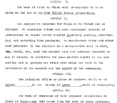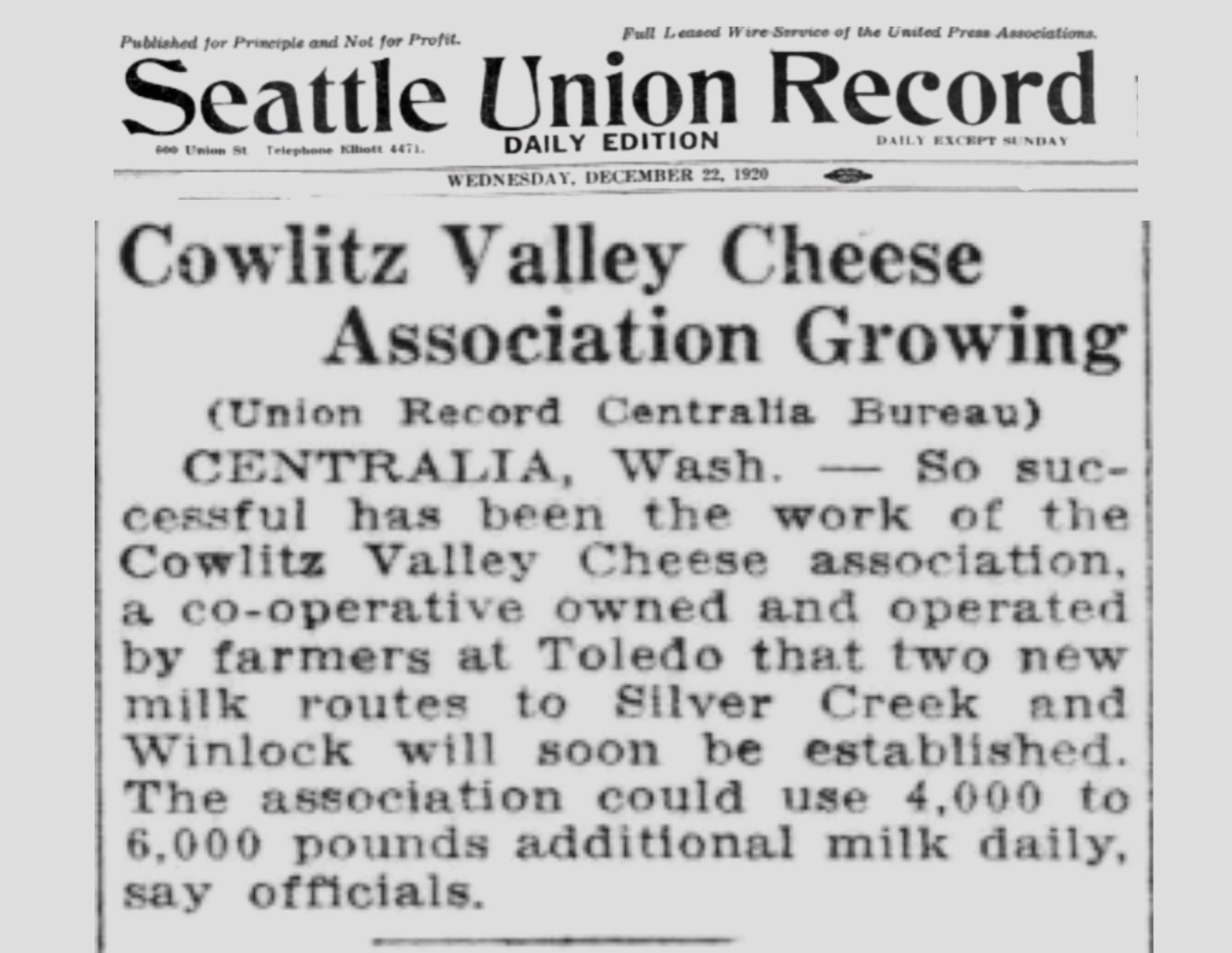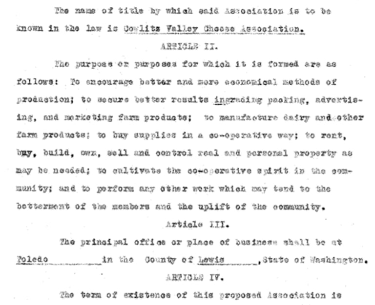 The Cowlitz Valley Cheese Association was a farmer owned cooperative initially formed on February 14th 1919 with a stated purpose “to encourage better and more economical methods of production: to secure better result in grading packing, advertising and marketing farm products; to manufacture dairy and other farm products; to buy supplies in a co-operative way; to rent, buy, build, own, sell and control real and personal property as may be needed; to cultivate the co-operative spirit in the community; and to perform any other work which may tend to the betterment of the members and the uplift of the community”.