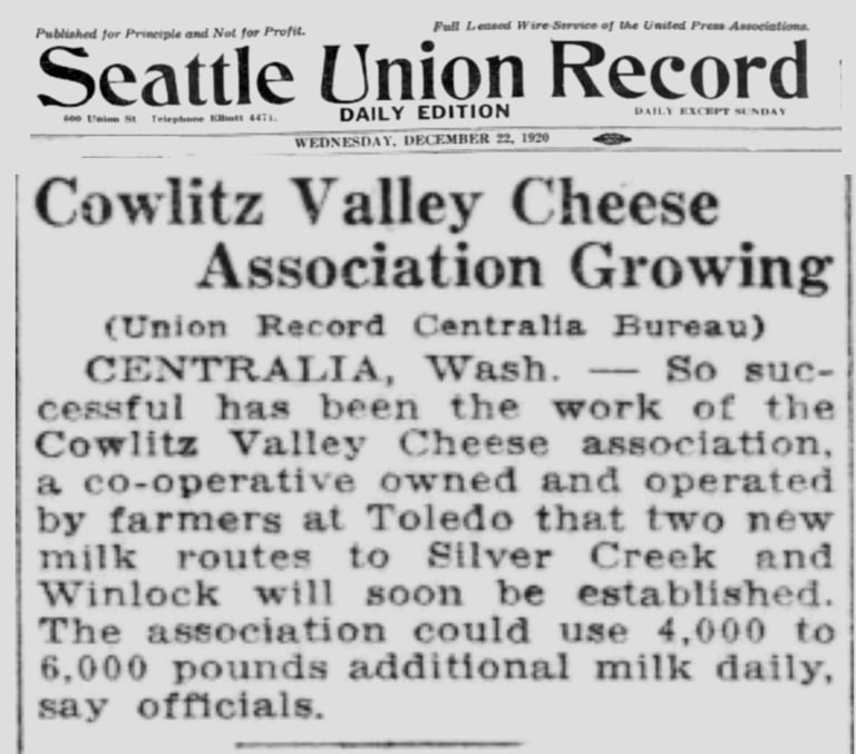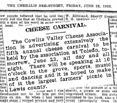 Within a few short years of formation, the Cowlitz Valley Cheese Association would advertise extensively their “Cheese Carnival” as the largest farmers picnic in Lewis County - always with music in the streets and cheese sandwiches featuring the finest Cowlitz Cheddar. Toledo became regionally known for this community festival, pride in their high quality product and their cooperative ownership of it. In the first three years of operation the cooperative plant handled 8,145,371 pounds of milk produced by the dairymen of the territory, for which they received $223,003.71 net to co-op owners.