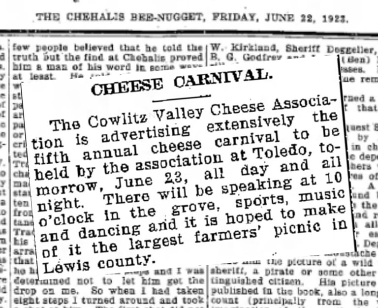 In 1922, secretary for the Washington State Chamber of Commerce T.J. O’Connor was quoted in the Chehalis Bee-Nugget newspaper after attending the fourth annual Cheese Carnival and giving his thoughts on the Toledo community.